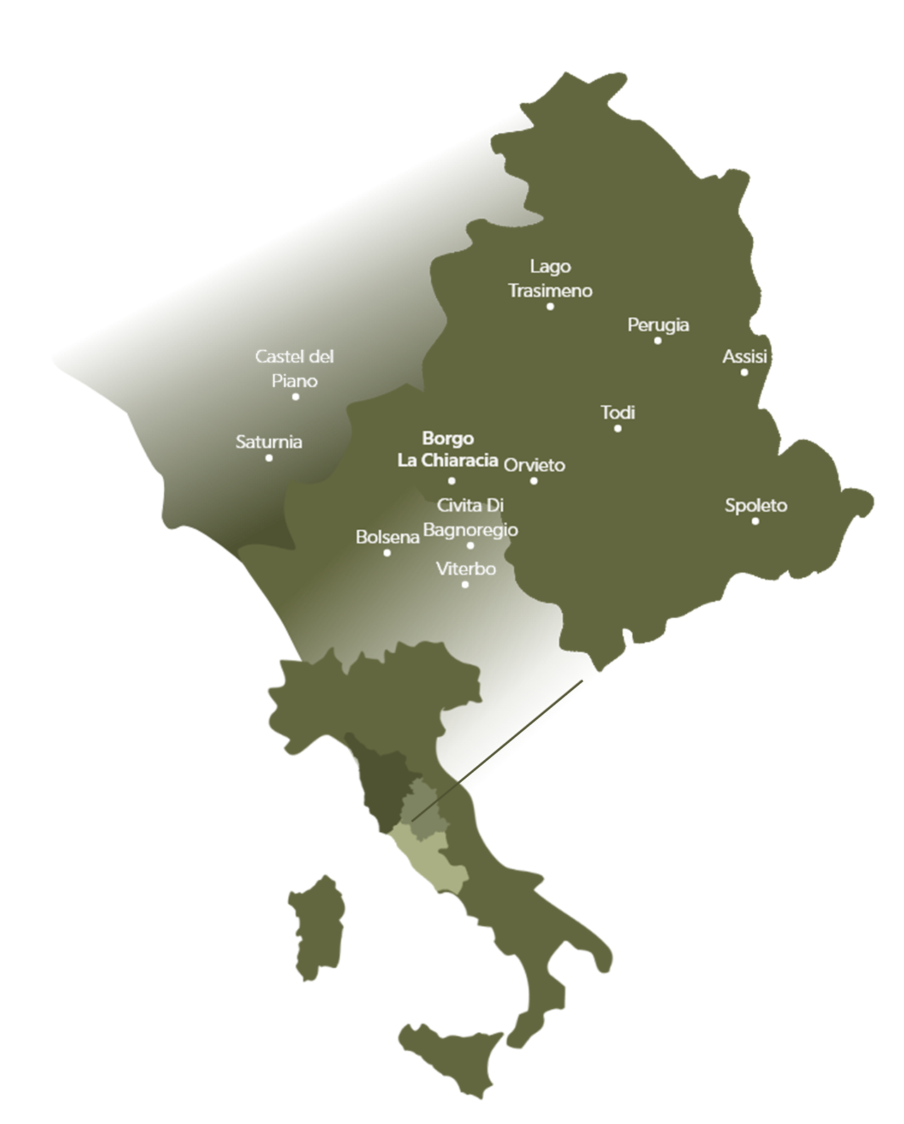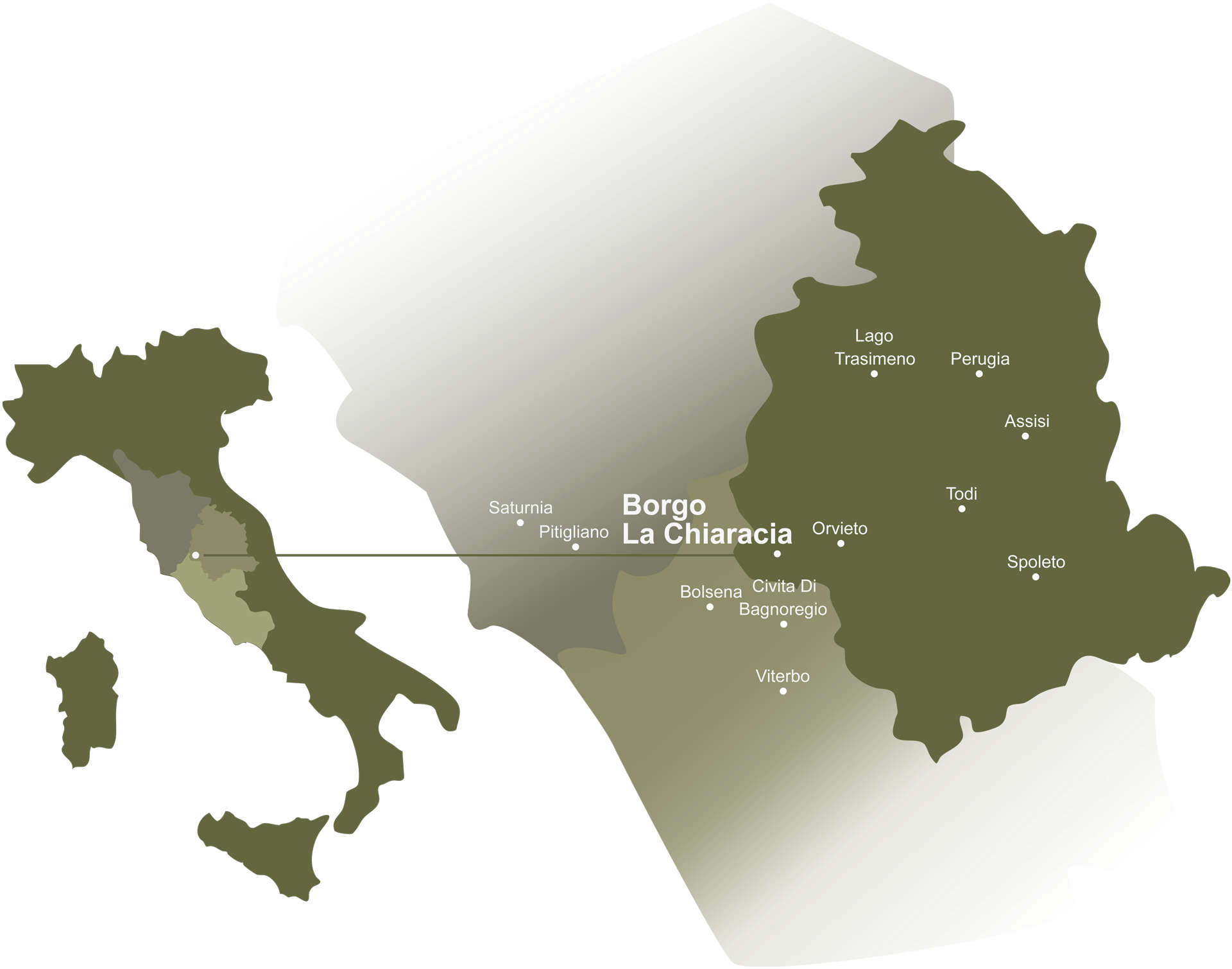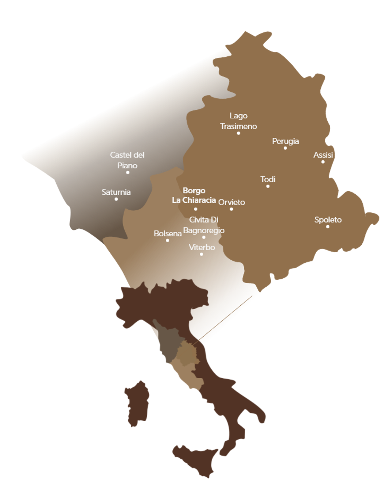 Si dice che alcuni luoghi non siano mera geografia, e che vadano localizzati nell’anima prima che sulla mappa. Borgo La Chiaracia sorge esattamente su uno di questi, e anzi, è in se stesso un eden di forza e vitalità. Posto com’è al crocevia fra Lazio, Umbria e Toscana, nel cuore dell’antica Etruria, si stende su colline abitate dalla notte dei tempi, quando persino Roma era di là da venire, ma più ancora della sua storia sono le caratteristiche a renderlo unico. Sorge su terra vulcanica, ricca di energia sopravvissuta alle ere e alle generazioni, e proprio per questo in grado di perdurare e nutrire senza fine chiunque ancora oggi ci transiti e ci soggiorni.