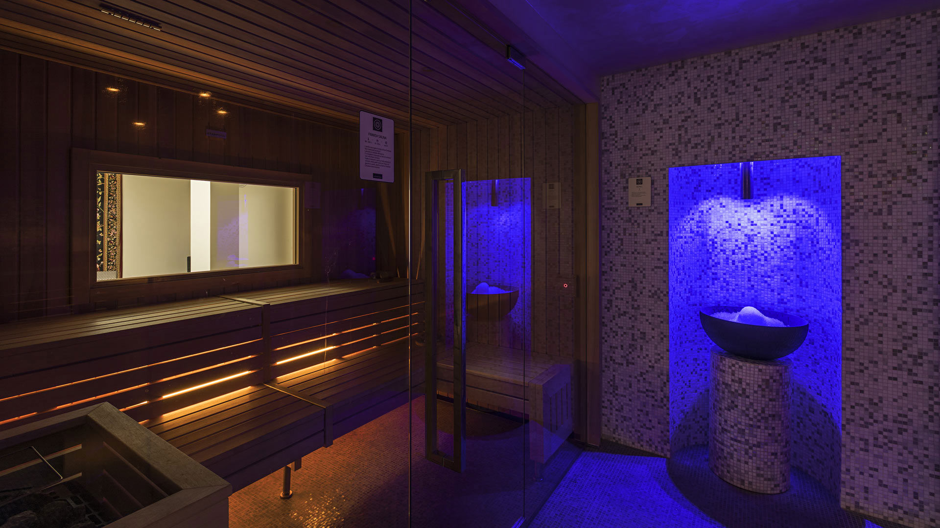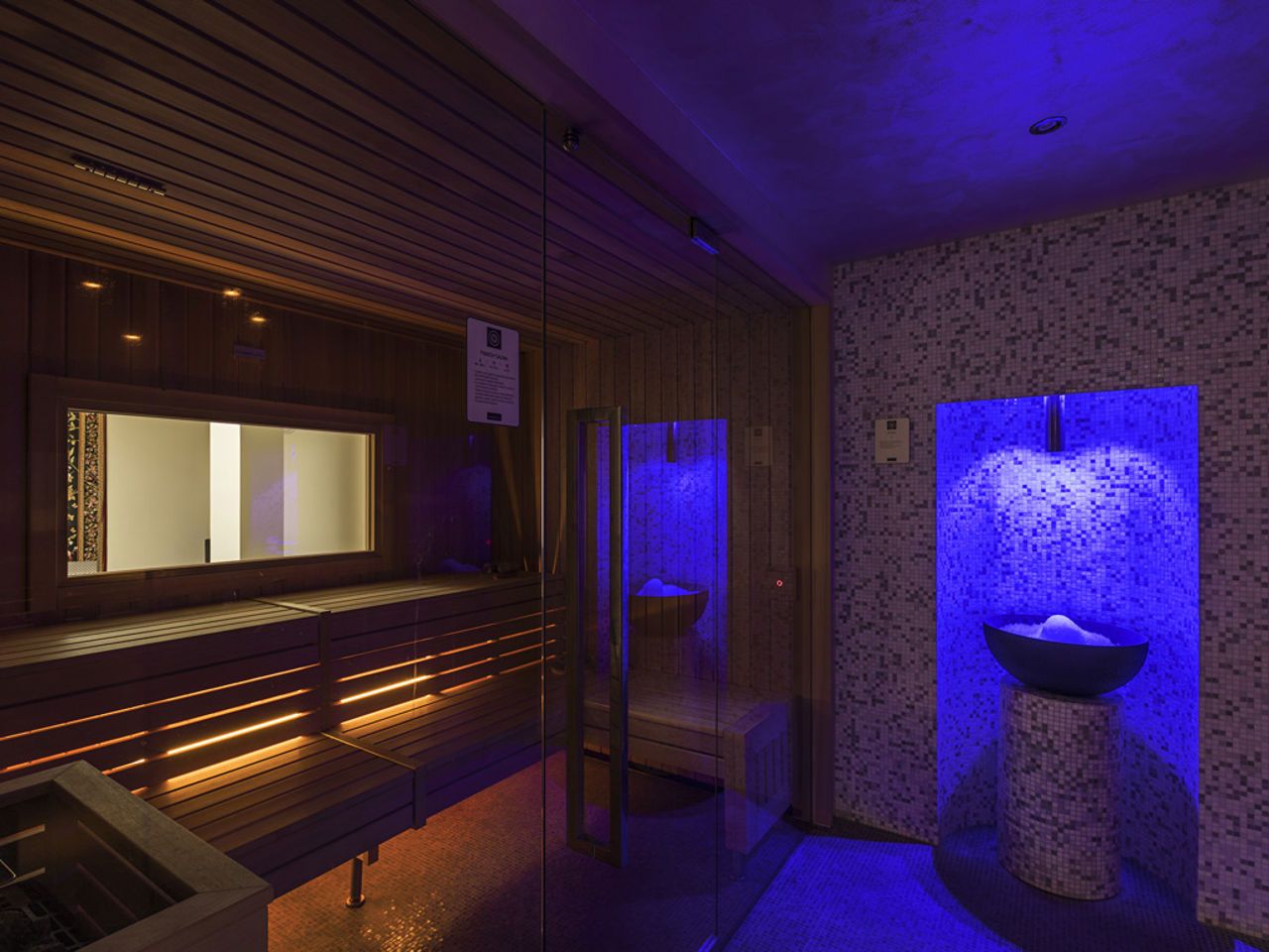 The experience is completed by the emotional shower, with light effects, scents, and temperatures that stimulate the senses, and the ice waterfall, perfect for a revitalizing scrub after the heat of the sauna or Turkish bath.