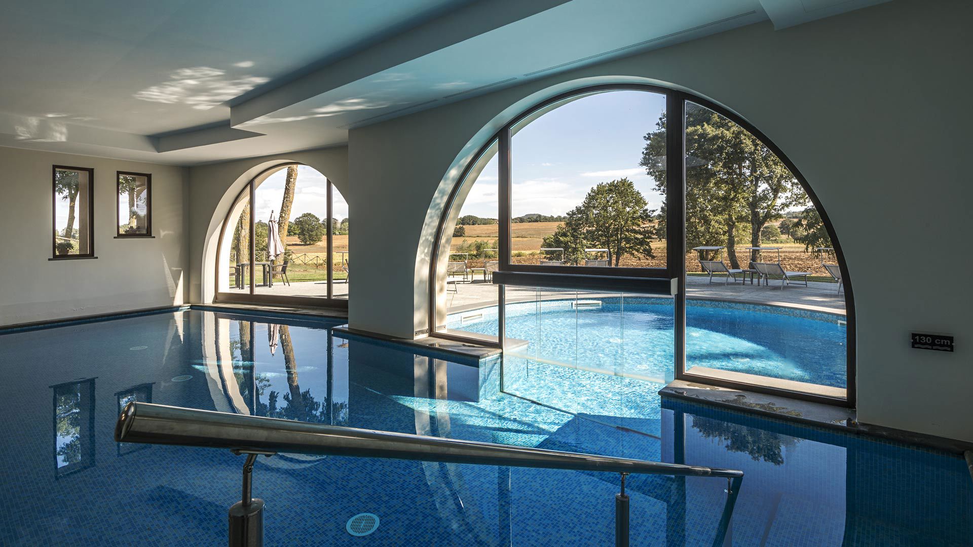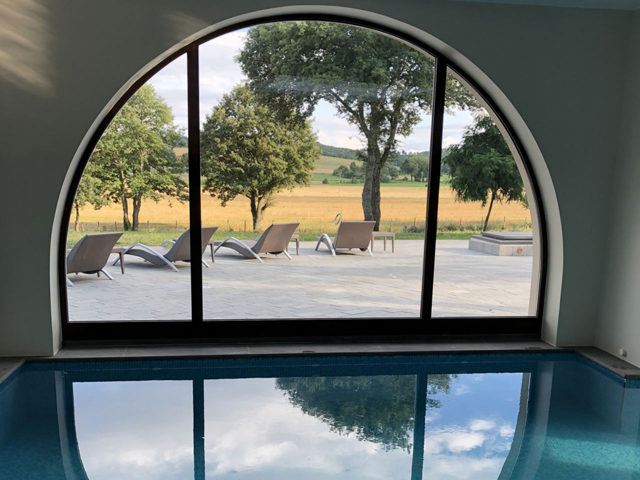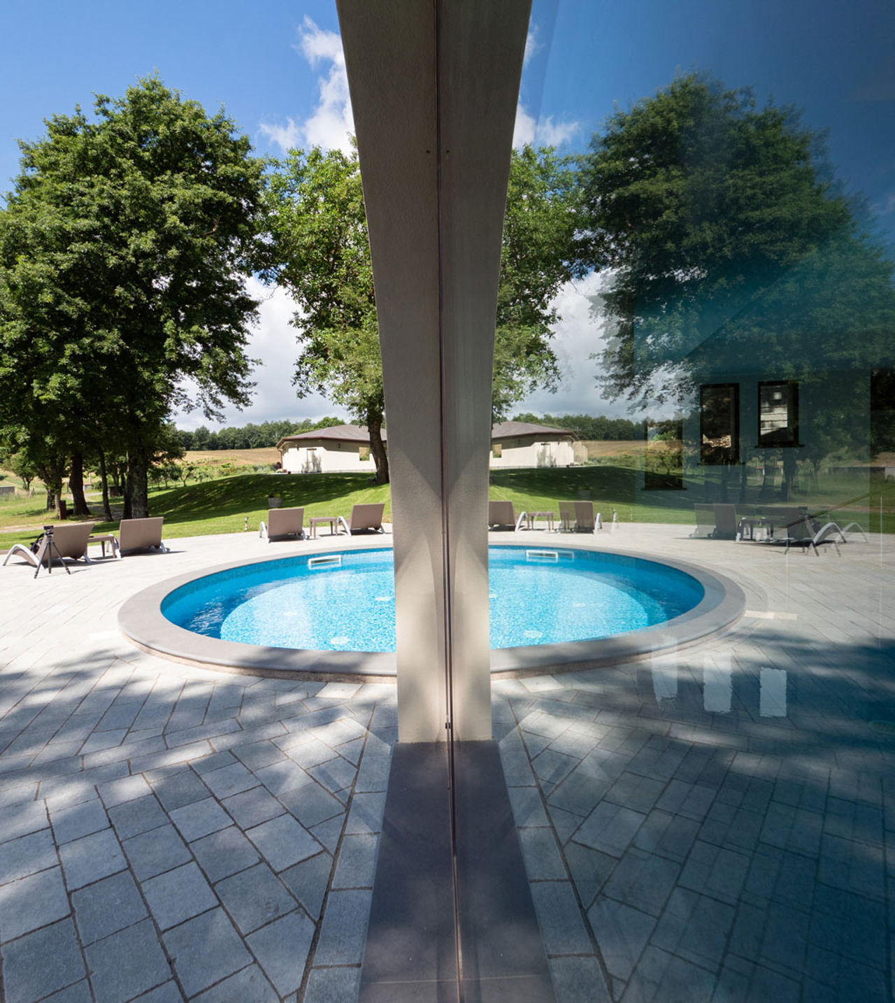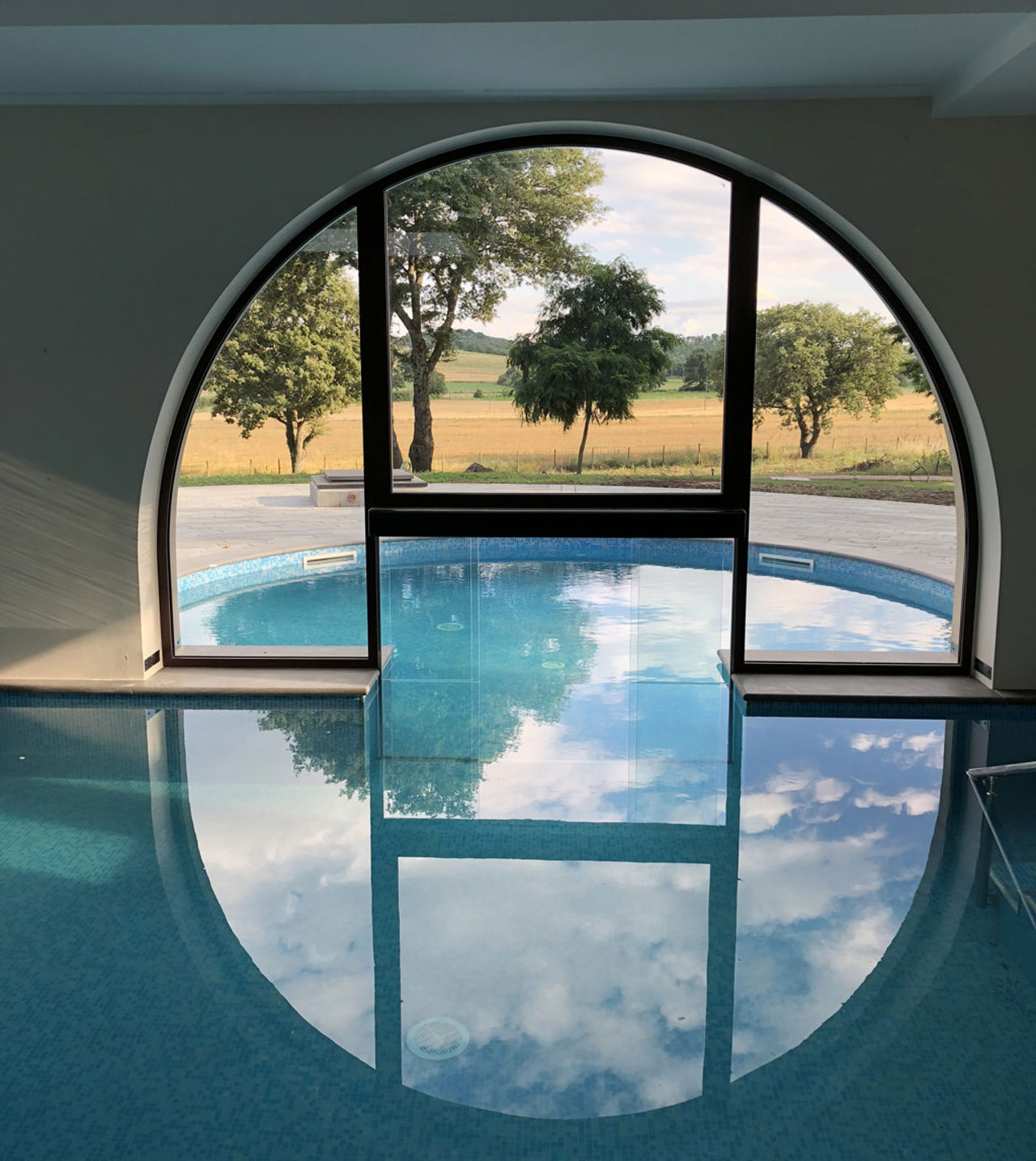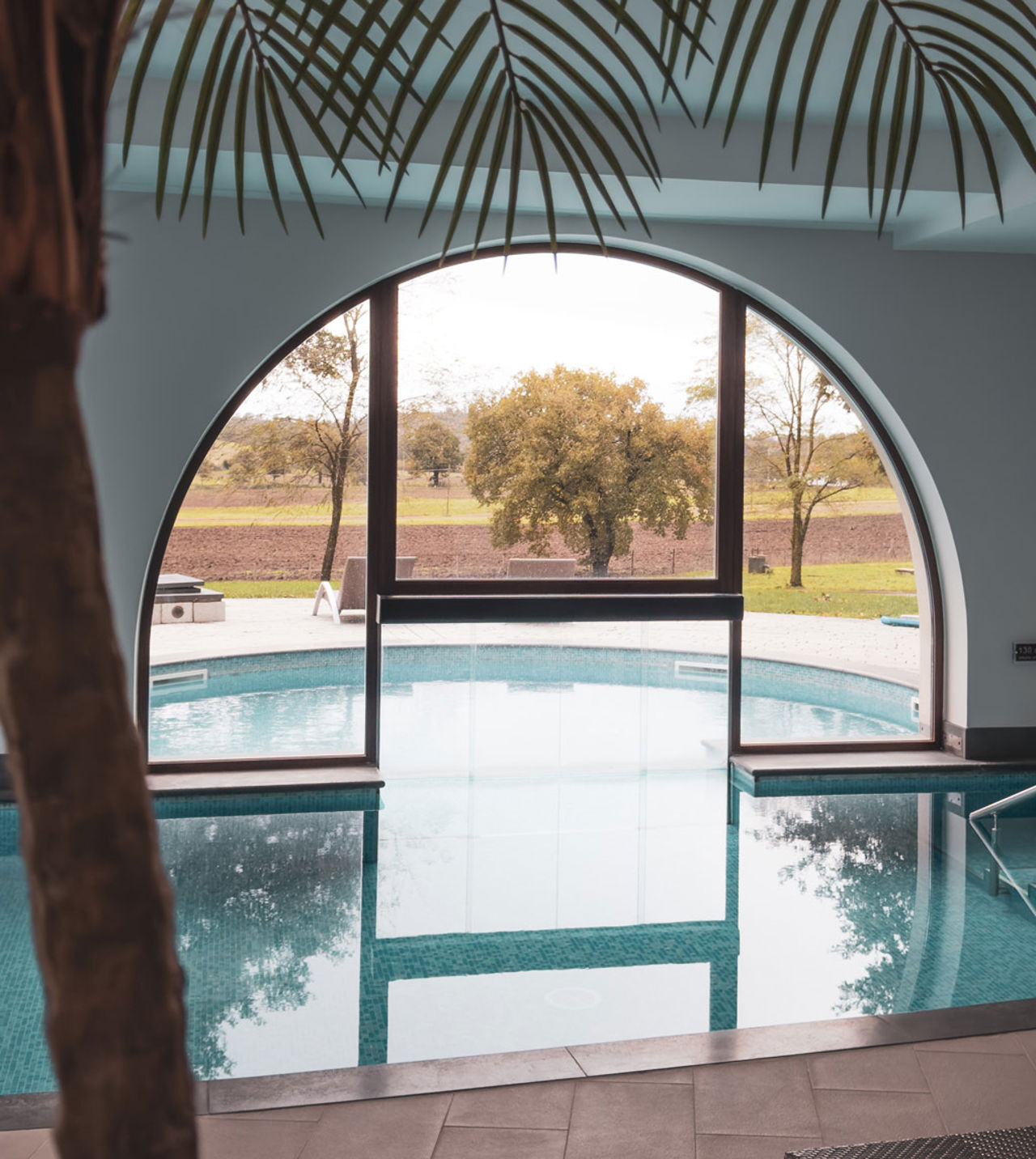 The door opens and a drop of happiness falls into your heart. We welcome you with an unforgettable view. Our spa unfolds like a painting appearing between the large windows immersed in the blue of the indoor pool and the green of the outdoor garden.
