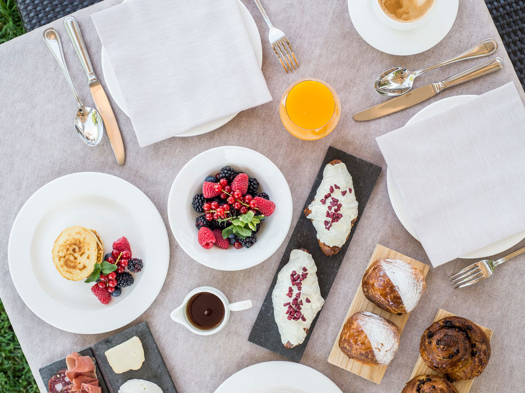Breakfast includes a rich menu with sweet options, organic jams, and baked goods from our bakery prepared by our pastry chef Rosalia, alongside an extremely tasty savoury section offering savoury dishes, cold cuts, sausages, and Umbrian cheeses.